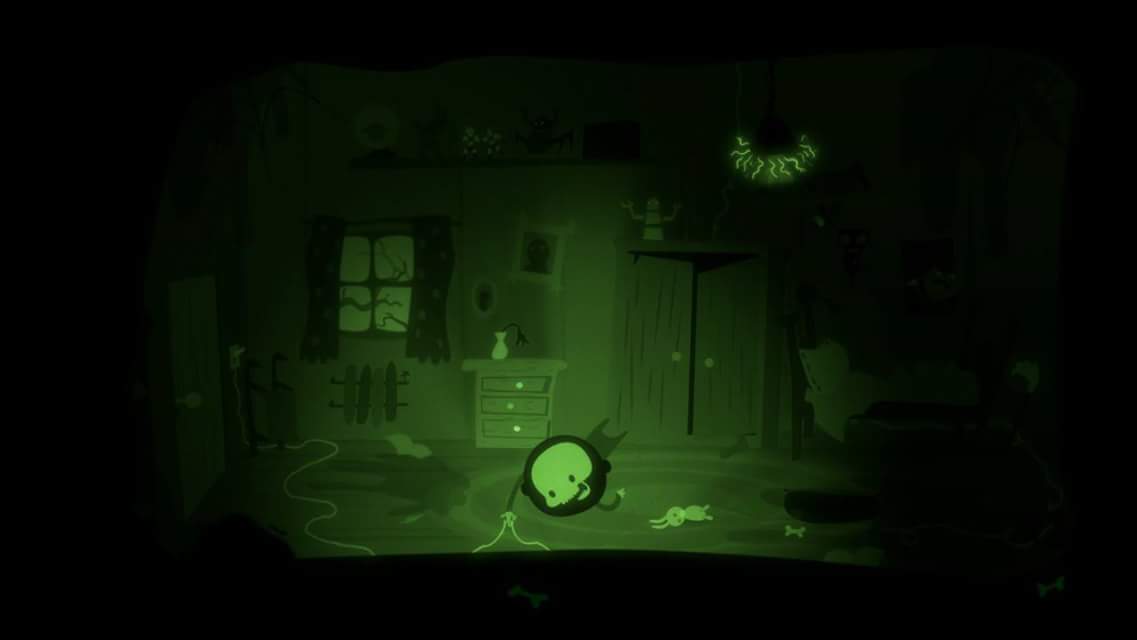 Controls are simple, and intuitive. The left stick moves Bulb Boy back and forth, and controls the cursor when investigating drawers, cupboards, and under furniture. At the appropriate moments. you can unscrew your head and toss it on to chandeliers hanging from the ceiling, which can be used to avoid obstacles that would otherwise block your movement. There will also be other opportunities for you to place your head in other advantageous positions, but I’ll let you explore and discover those for yourself. A is your default action button, and you use the left and right shoulder buttons to navigate your collected inventory. The puzzles themselves are just as intuitive as the controls. You click on anything around that room that lights up, and if you can’t leave the room yet, it usually just takes a little bit of poking around and experimentation to get yourself unstuck. The puzzles are satisfying once solved, and there are even a few occasional boss fights that are reaction based to keep things a little more interesting as you traverse your house and solve the mystery.